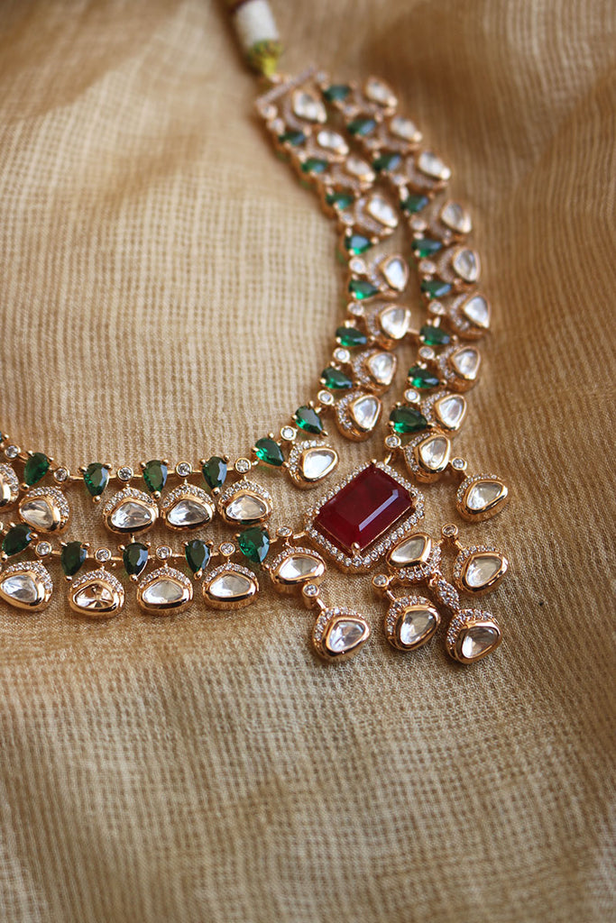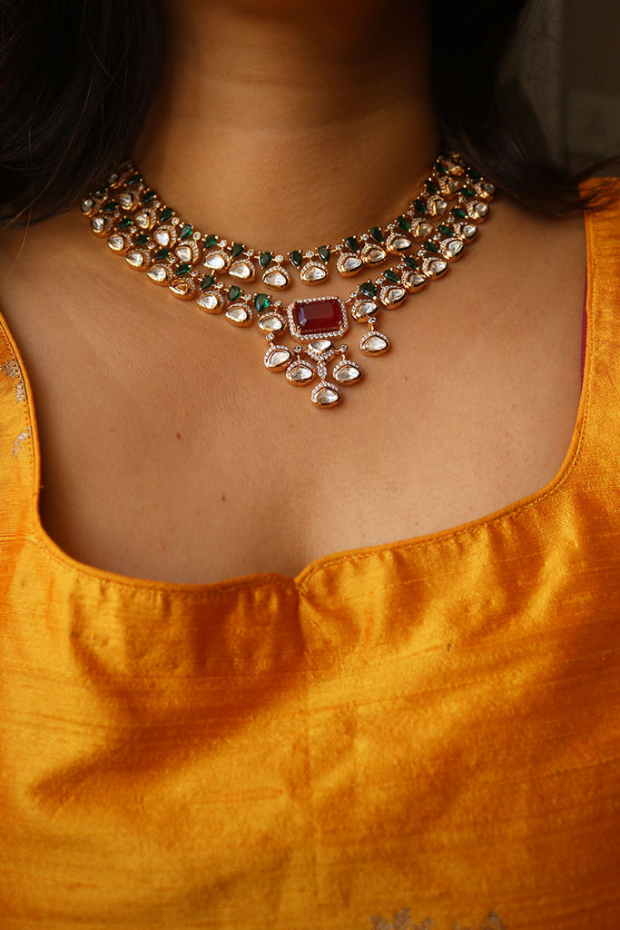 Two Layer Polki Emerald Close Neck Set