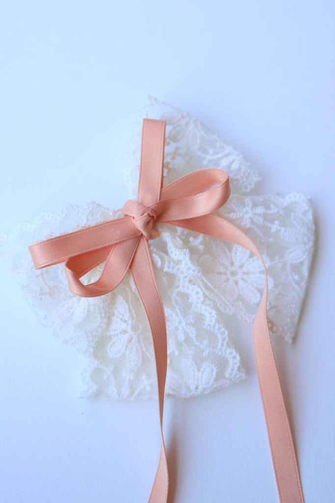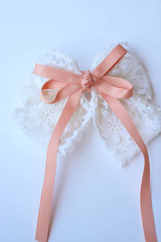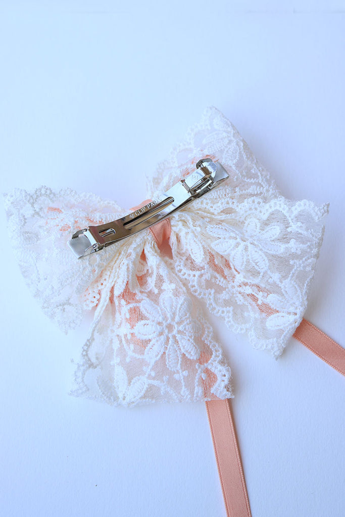 Our showstopper barrette is the best find we have had. This lace based barrette is supported with a buckle clip on the rear side. A styling tip is to use thin plastic rubber band to make a half pony and tuck this buckle clip to conceal it. The only variant is Off White lace with peach ribbon detailing.